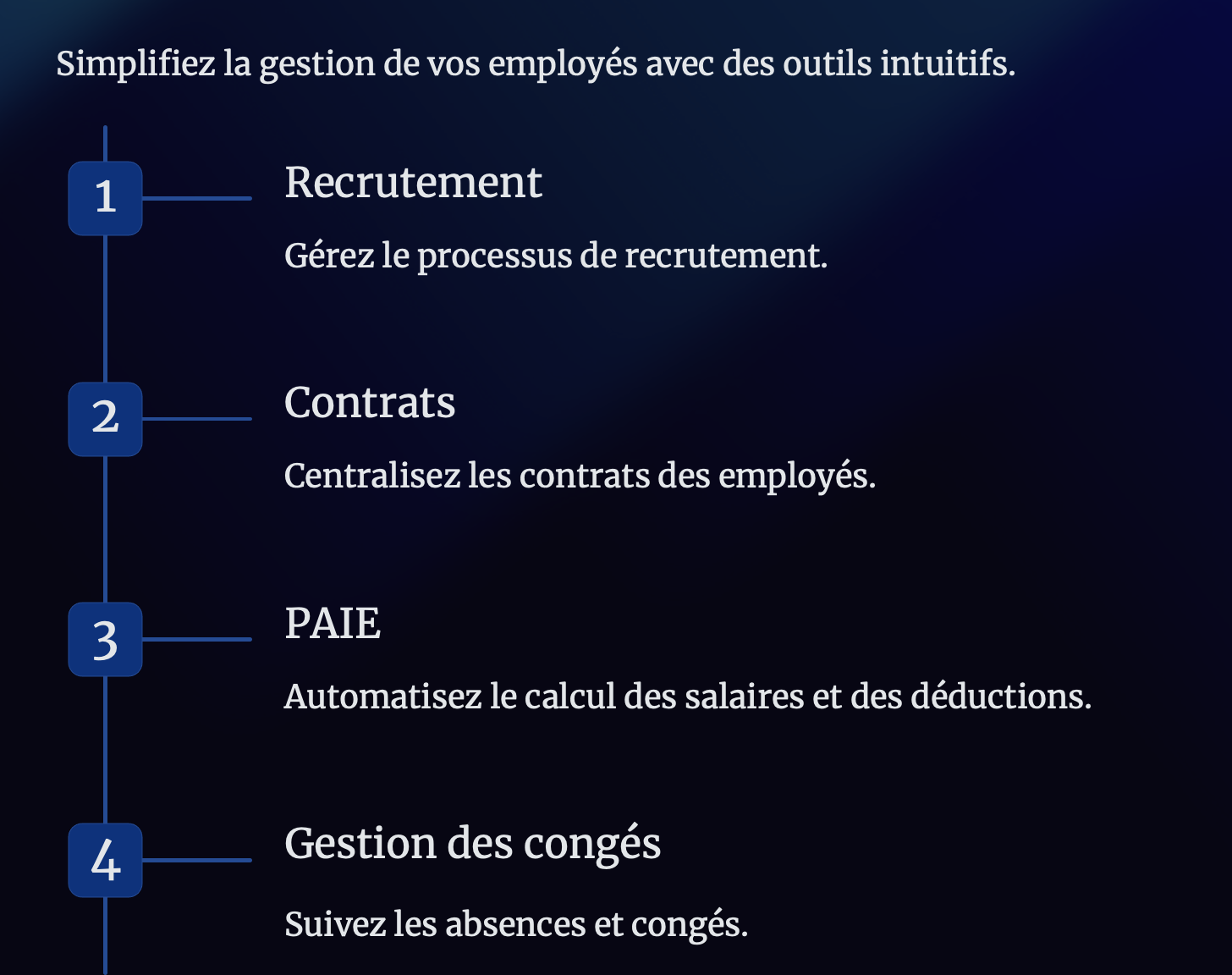 LAM-GRH couvre tous les aspects de la gestion RH : administration du personnel, recrutement, paie, évaluations, et bien plus. Une solution intégrée pour optimiser la gestion de votre capital humain.